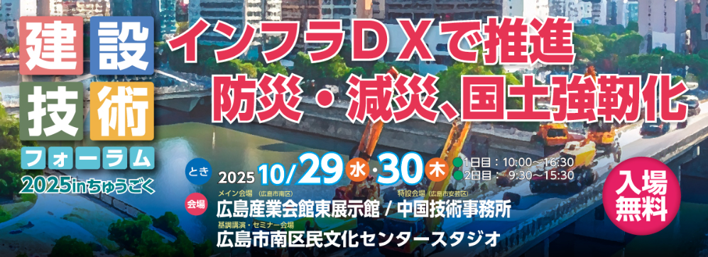 イベント参加【イベント情報】建設技術フォーラム2025inちゅうごくへ出展いたします 公開日 2025/9/30シンクロアイズは建設技術フォーラムinちゅうごくに出展いたします。≪開催概要≫2025年10月29日(水)10:00~16:30~10月30日(木)9:30~15:30≪会場≫広島産業会館東展示館当社ブース No.117 建設技術フォーラムinちゅうごく 公式サイトはこちら。皆様のご来場お待ちしております。